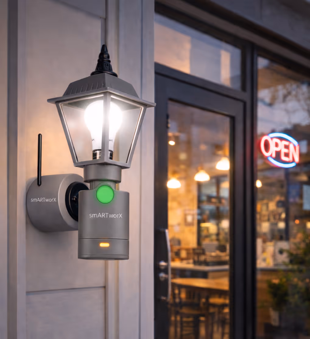 The smARTworX EEL Box converts any existing porch light into a smart power and connectivity hub, delivering lighting control, exterior outlets, Power over Ethernet support, WiFi extension, and solar backup, without changing the look of a property or requiring an electrician.